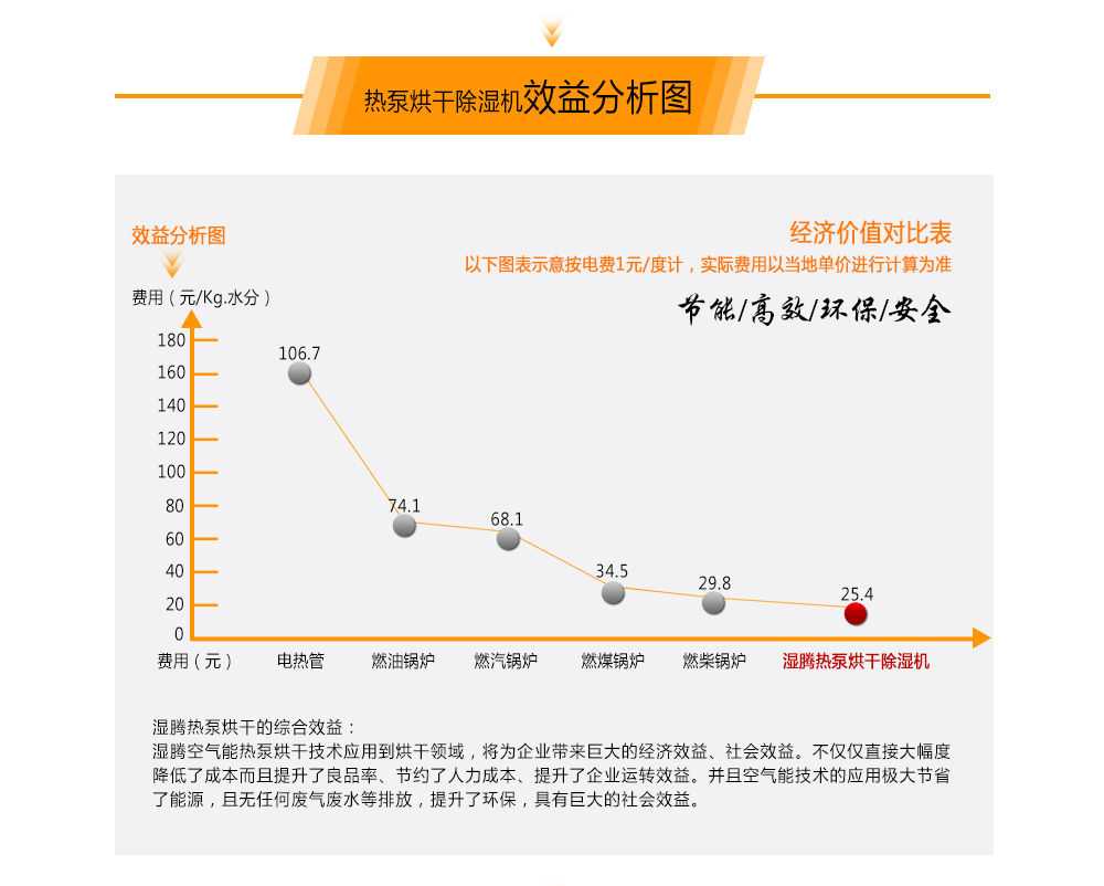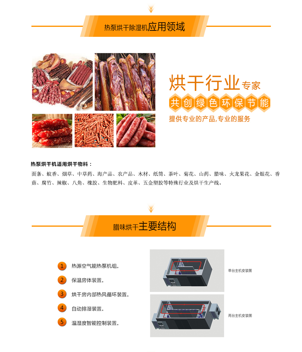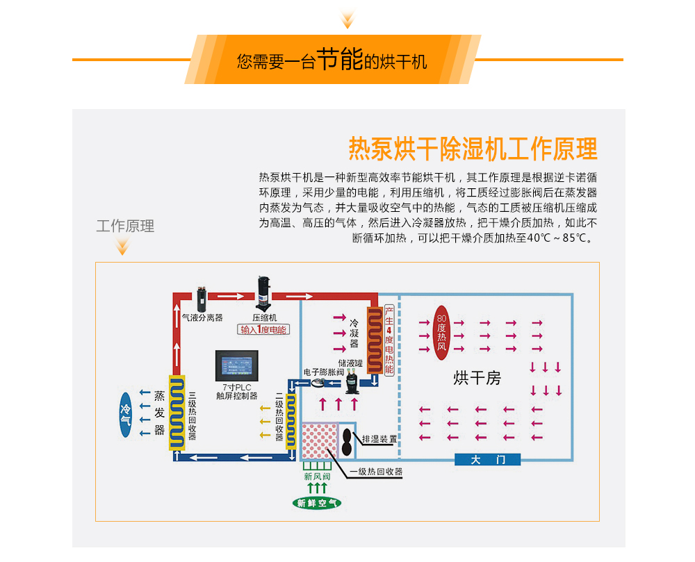 熱泵烘干機是一種新型高效率節能烘干機,其工作原理是根據逆卡諾循環原理,采用少量的電能,利用壓縮機,將工質經過膨脹閥后在蒸發器內蒸發為氣態,并大量 吸收空氣中的熱能,氣態的工質被壓縮機壓縮成為高溫、高壓的氣體,然后進入冷凝器放熱,把干燥介質加熱,如此不斷循環加熱,可以把干燥介質加熱至 40℃~85℃。相對于電熱烘干機而言,節約了三分之二的電能。